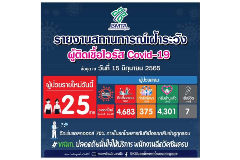เพจองค์การขนส่งมวลชนกรุงเทพ โพสต์ระบุว่า ประกาศคณะทำงานศูนย์ปฏิบัติการภาวะฉุกเฉินโรคติดเชื้อไวรัส โคโรนา 2019 (COVID - 19) ประจำวันที่ 15 มิถุนายน 2565 พบพนักงานติดเชื้อฯ จำนวน 25 ราย ติดเชื้อสะสม 4,683 ราย กำลังรักษา 375 ราย กลับบ้านแล้ว 4,301 ราย เสียชีวิตสะสม 7 ราย