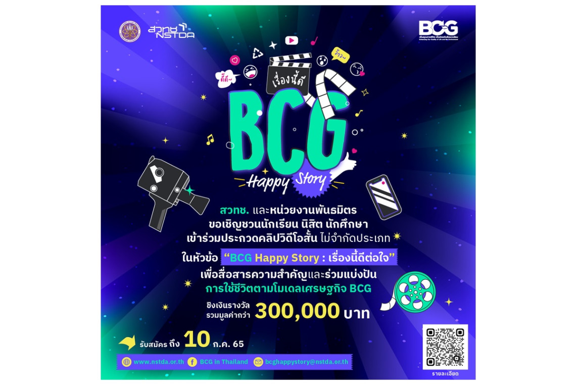 ปัจจุบันรัฐบาลเห็นชอบให้โมเดลเศรษฐกิจบีซีจี (BCG Economy Model) เป็นวาระแห่งชาติ โมเดลเศรษฐกิจใหม่ที่จะเป็นกลไกสำคัญในการขับเคลื่อนเศรษฐกิจไทยให้ก้าวพ้นกับดักรายได้ปานกลาง ด้วยการนำวิทยาศาสตร์ เทคโนโลยี และนวัตกรรมมาต่อยอดความหลากหลายทางชีวภาพและวัฒนธรรมที่เป็นจุดแข็งของประเทศให้มีมูลค่าเพิ่มขึ้น โดยคำนึงถึงการรักษาสมดุลของทรัพยากรและสิ่งแวดล้อมอย่างยั่งยืน ทั้งนี้เพื่อสร้างการตระหนักรับรู้เกี่ยวกับโมเดลเศรษฐกิจ BCG แก่ประชาชนทั่วไป กระทรวงการอุดมศึกษา วิทยาศาสตร์ วิจัยและนวัตกรรม (อว.) โดยสำนักงานพัฒนาวิทยาศาสตร์และเทคโนโลยีแห่งชาติ (สวทช.) จึงได้จัดการแข่งขัน “โครงการประกวดคลิปวิดีโอ BCG Happy Story: เรื่องนี้ดีต่อใจ” โดยเปิดรับสมัครตั้งแต่วันนี้ถึง 10 ก.ค. 2565
