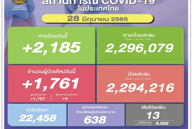 วันที่ 28 มิ.ย.2565 ศูนย์ข้อมูล COVID-19 รายงานยอดผู้ติดเชื้อโควิด-19 รายใหม่จำนวน 1,761 ราย ทำให้ยอดผู้ป่วยสะสมตั้งแต่ 1 มกราคม 2565 มีจำนวน 2,294,216 ราย หายป่วยกลับบ้าน 2,185 ราย ทำให้ยอดหายป่วยสะสม ตั้งแต่ 1 มกราคม 2565 มีจำนวน 2,296,079 ราย ผู้ป่วยกำลังรักษา 22,458 ราย และเสียชีวิต 13 ราย รวมเสียชีวิตสะสมตั้งแต่ ปี 2563-ปัจจุบัน จำนวน 30,620 ราย