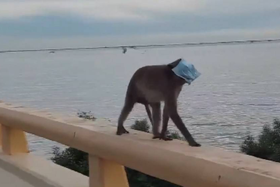 พบลิงแสมแสนรู้ เอาแมสก์ปิดจมูกมาใส่ปิดหน้าเดินบนราวสะพานใหม่ คาดกลัวโควิด 19 ที่ยังคงแพร่ระบาด อย่างต่อเนื่อง