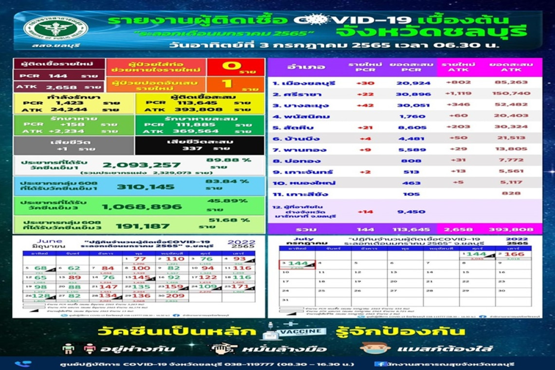 วันที่ 3 ก.ค.65 สำนักงานสาธารณสุขจังหวัดชลบุรี สสจ.ชลบุรี รายงานสถานการณ์โควิด-19 วันนี้ มีผู้ติดเชื้อโควิด-19 ยืนยันรายใหม่ RT-PCR จำนวน 144 ราย ผู้เข้าข่ายติดเชื้อโควิด-19 ATK 2,658 ราย
