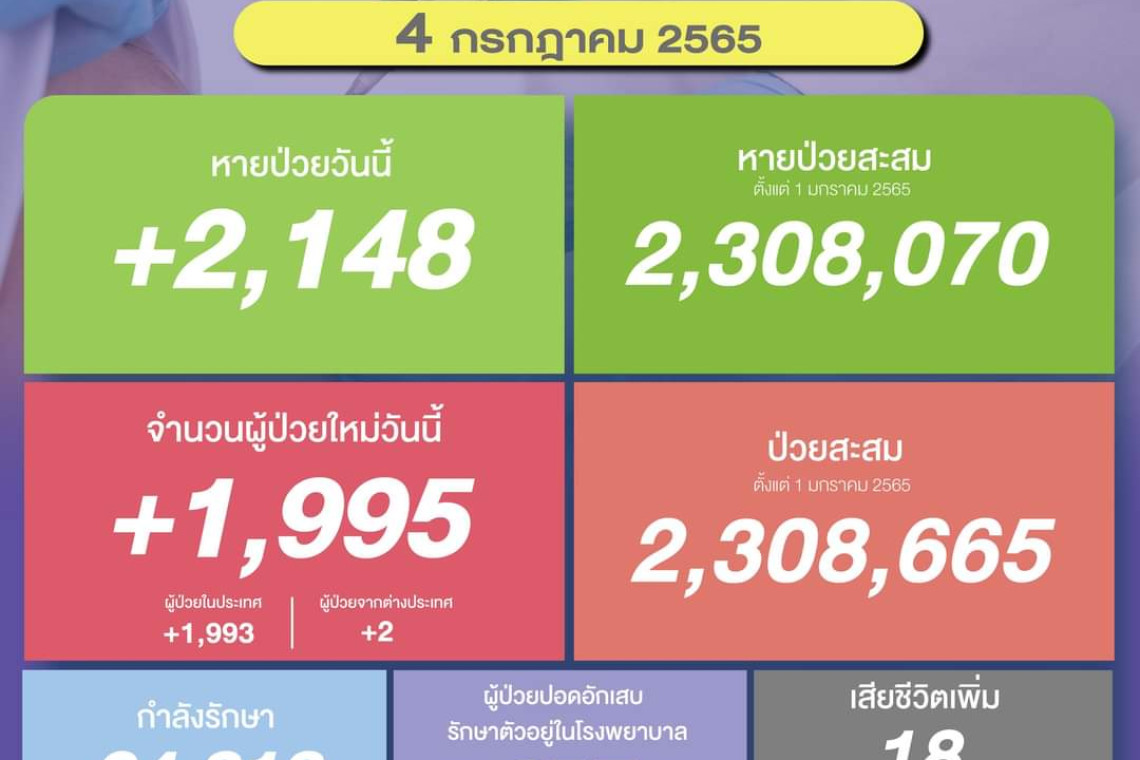 วันที่ 4 ก.ค.2565 ศูนย์ข้อมูล COVID-19 รายงานยอดผู้ติดเชื้อโควิด-19 รายใหม่จำนวน 1,995 ราย ทำให้ยอดผู้ป่วยสะสมตั้งแต่ 1 มกราคม 2565 มีจำนวน 2,308,665 ราย หายป่วยกลับบ้าน 2,148 ราย ทำให้ยอดหายป่วยสะสม ตั้งแต่ 1 มกราคม 2565 มีจำนวน 2,308,070 ราย ผู้ป่วยกำลังรักษา 24,818 ราย และเสียชีวิต 18 ราย รวมเสียชีวิตสะสมตั้งแต่ ปี 2563-ปัจจุบัน จำนวน 30,718 ราย