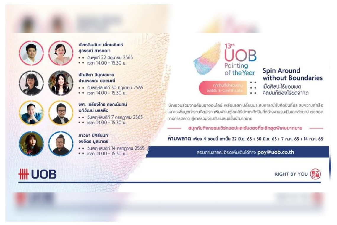 ธนาคารยูโอบี ประเทศไทย ชวนนักเรียน นักศึกษา ศิลปินและบุคคลทั่วไปที่รักงานศิลปะ มาหาแรงบันดาลใจ พร้อมแลกเปลี่ยนประสบการณ์ด้านศิลปะในกิจกรรมโรดโชว์เสวนาศิลปะผ่านออนไลน์ หัวข้อ “Spin Around without Boundaries…เมื่อศิลปะไร้ขอบเขต ศิลปินก็ต้องไร้ขีดจำกัด” กับศิลปินที่ประสบความสำเร็จในการเพิ่มมูลค่างานศิลปะจากผืนผ้าใบสู่โลกดิจิทัล และศิลปินที่สร้างสร้างสรรค์ผลงานอันเป็นเอกลักษณ์ จนสามารถต่อยอดทางการตลาดผ่านการร่วมงานกับแบรนด์ชั้นนำอีกมากมาย โดยกิจกรรมโรดโชว์จะจัดขึ้นผ่าน Live Streaming เหลือเพียง 2 รอบสุดท้ายเท่านั้น ในวันที่ 7 และ 14 กรกฎาคม 2565