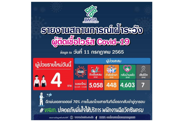 เพจองค์การขนส่งมวลชนกรุงเทพ โพสต์ระบุว่า ประกาศคณะทำงานศูนย์ปฏิบัติการภาวะฉุกเฉินโรคติดเชื้อไวรัส โคโรนา 2019 (COVID - 19) ประจำวันที่ 11 กรกฎาคม 2565 พบพนักงานติดเชื้อฯ จำนวน 4 ราย ติดเชื้อสะสม 5,058 ราย กำลังรักษา 448 ราย กลับบ้านแล้ว 4,603 ราย เสียชีวิตสะสม 7 ราย