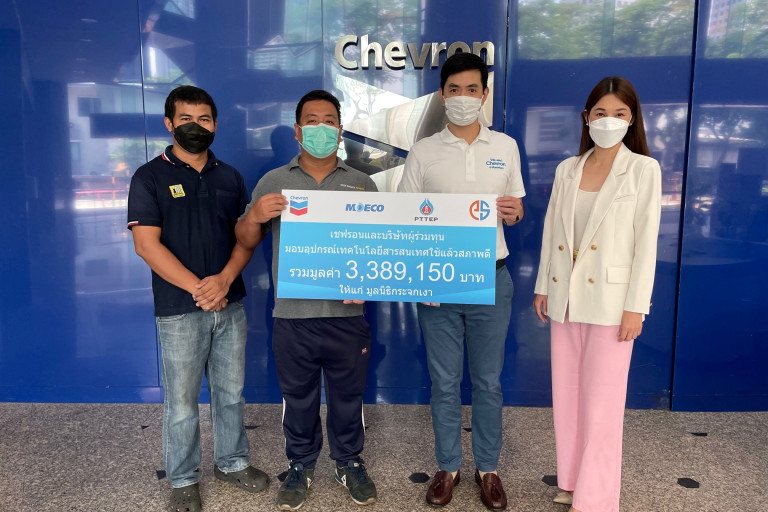 เมื่อเร็วๆ นี้ บริษัท เชฟรอนประเทศไทยสำรวจและผลิต จำกัด นำโดย นายภาณุ บุญวัฒโนภาส (ที่ 2 จากขวา) รองประธานกรรมการบริหาร ฝ่ายดิจิทัลและเทคโนโลยีสารสนเทศ พร้อมด้วยนางสาวพรสุรีย์ กอนันทา (ขวาสุด) รองประธานกรรมการบริหาร ฝ่ายกิจการองค์กร เป็นตัวแทนบริษัทฯ มอบอุปกรณ์เทคโนโลยีสารสนเทศใช้งานแล้วสภาพดี อาทิ คอมพิวเตอร์แบบตั้งโต๊ะและพกพา จอภาพแสดงผล เครื่องถ่ายเอกสาร โทรศัพท์มือถือและโทรศัพท์ VoIP (Voice over Internet Protocol) รวมทั้งสิ้น 68 รายการ จำนวนกว่า 1,300 ชิ้น รวมมูลค่ากว่า 3.3 ล้านบาท แก่นายณัฐวัฒน์ คงสุขสวัสดิ์ (ที่ 2 จากซ้าย) หัวหน้าโครงการคอมพิวเตอร์เพื่อน้อง มูลนิธิกระจกเงา เพื่อให้ทางมูลนิธินำไปส่งมอบให้กับโรงเรียนขนาดเล็กที่ขาดแคลนอุปกรณ์ได้เข้าถึงเทคโนโลยีการเรียนการสอนอันจะช่วยเพิ่มประสิทธิภาพการเรียนรู้ของเยาวชนต่อไป