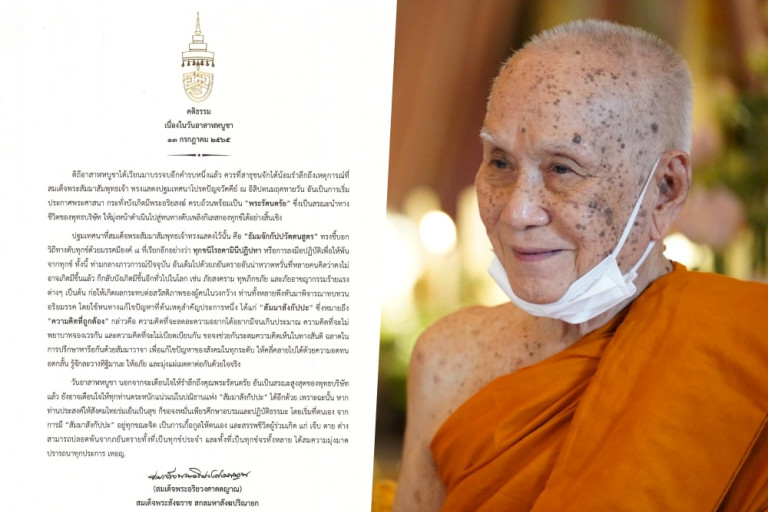 เมื่อวันที่ 12 ก.ค.65 เพจ สำนักงานเลขานุการสมเด็จพระสังฆราช โพสต์ข้อความระบุว่า เจ้าพระคุณ สมเด็จพระอริยวงศาคตญาณ สมเด็จพระสังฆราช สกลมหาสังฆปริณายก ประทานพระคติธรรม เนื่องในวันอาสาฬหบูชา วันพุธ ที่ 13 กรกฎาคม 2565 ความว่า