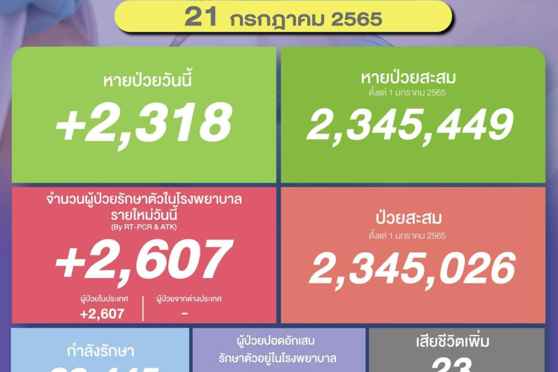 วันที่ 21 ก.ค.2565 ศูนย์ข้อมูล COVID-19 รายงานยอดผู้ติดเชื้อโควิด-19 รายใหม่จำนวน 2,607 ราย ทำให้ยอดผู้ป่วยสะสมตั้งแต่ 1 มกราคม 2565 มีจำนวน 2,345,026 ราย หายป่วยกลับบ้าน 2,318 ราย ทำให้ยอดหายป่วยสะสม ตั้งแต่ 1 มกราคม 2565 มีจำนวน 2,345,449 ราย ผู้ป่วยกำลังรักษา 23,445 ราย และเสียชีวิต 23 ราย รวมเสียชีวิตสะสมตั้งแต่ ปี 2563-ปัจจุบัน จำนวน 31,073 ราย