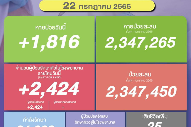 วันที่ 22 ก.ค.2565 ศูนย์ข้อมูล COVID-19 รายงานยอดผู้ติดเชื้อโควิด-19 รายใหม่จำนวน 2,424 ราย ทำให้ยอดผู้ป่วยสะสมตั้งแต่ 1 มกราคม 2565 มีจำนวน 2,347,450 ราย หายป่วยกลับบ้าน 1,816 ราย ทำให้ยอดหายป่วยสะสม ตั้งแต่ 1 มกราคม 2565 มีจำนวน 2,347,265 ราย ผู้ป่วยกำลังรักษา 24,028 ราย และเสียชีวิต 25 ราย รวมเสียชีวิตสะสมตั้งแต่ ปี 2563-ปัจจุบัน จำนวน 31,098 ราย