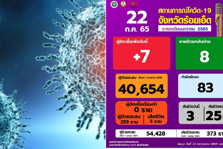 ผู้สื่อข่าวรายงาน ว่า นายแพทย์ปิติ ทั้งไพศาล นพ.สสจ.ร้อยเอ็ด มอบหมายให้ จนท.รายงานสถานการณ์ไวรัสโคโรนา 2019 COVID-19 จังหวัดร้อยเอ็ด ประจำวันที่ 22 กรกฎาคม 2565 ดังนี้ ผู้ติดเชื้อรายใหม่ วันนี้ (ระลอก มกราคม 2565)ใน4 อำเภอจาก20อำเภอ 7 ราย ผู้ป่วยสะสม 40,654 รายรักษาหาย 8 ราย คงพยาบาล 83 ราย เสียชีวิต 3 ราย เสียชีวิตสะสม 255 ราย ยอดผู้ป่วยโควิด 19 ยืนยันสะสม ในจังหวัดร้อยเอ็ด ยอดสะสม 54,428 ราย เรือนจำ 0 ราย เสียชีวิตสะสม 373 ราย