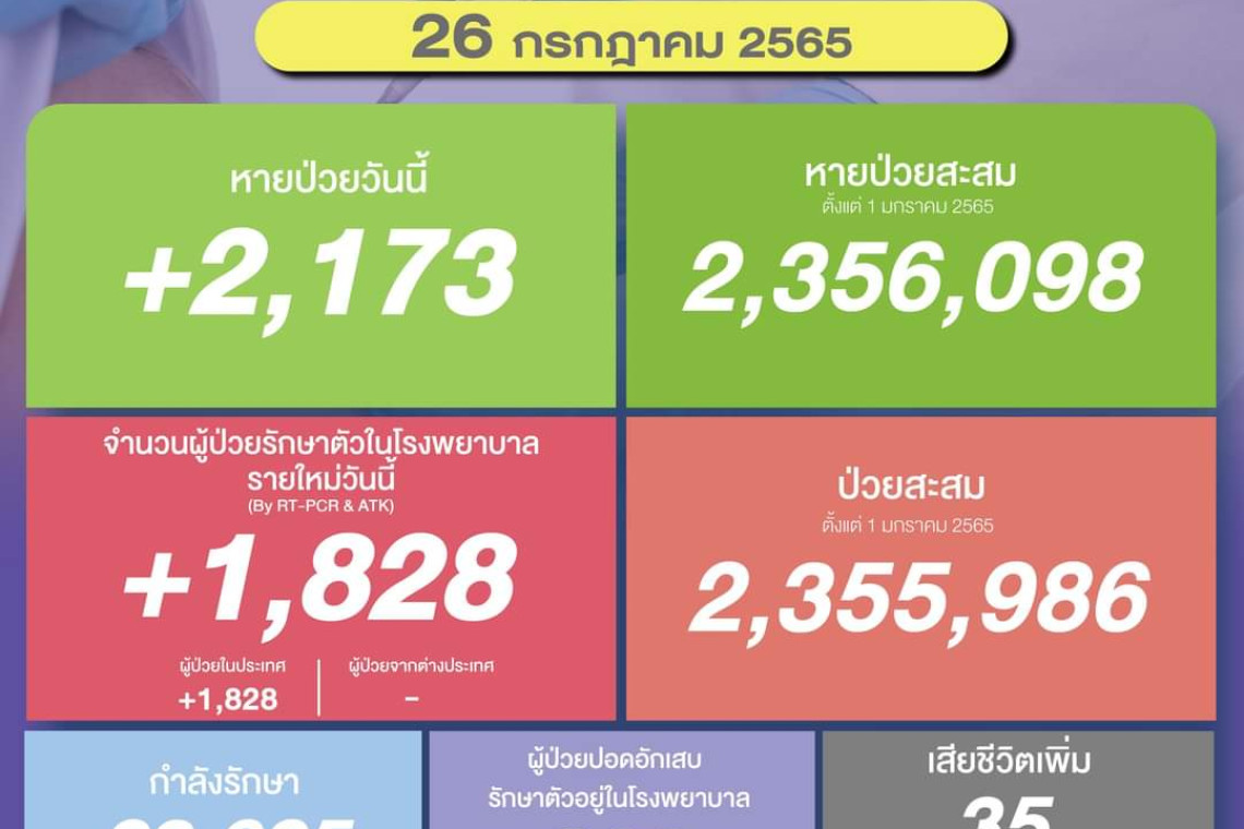วันที่ 25 ก.ค.2565 ศูนย์ข้อมูล COVID-19 รายงานยอดผู้ติดเชื้อโควิด-19 รายใหม่จำนวน 1,828 ราย ทำให้ยอดผู้ป่วยสะสมตั้งแต่ 1 มกราคม 2565 มีจำนวน 2,355,986 ราย หายป่วยกลับบ้าน 2,173 ราย ทำให้ยอดหายป่วยสะสม ตั้งแต่ 1 มกราคม 2565 มีจำนวน 2,356,098 ราย ผู้ป่วยกำลังรักษา 23,605 ราย และเสียชีวิต 35 ราย รวมเสียชีวิตสะสมตั้งแต่ ปี 2563-ปัจจุบัน จำนวน 31,224 ราย