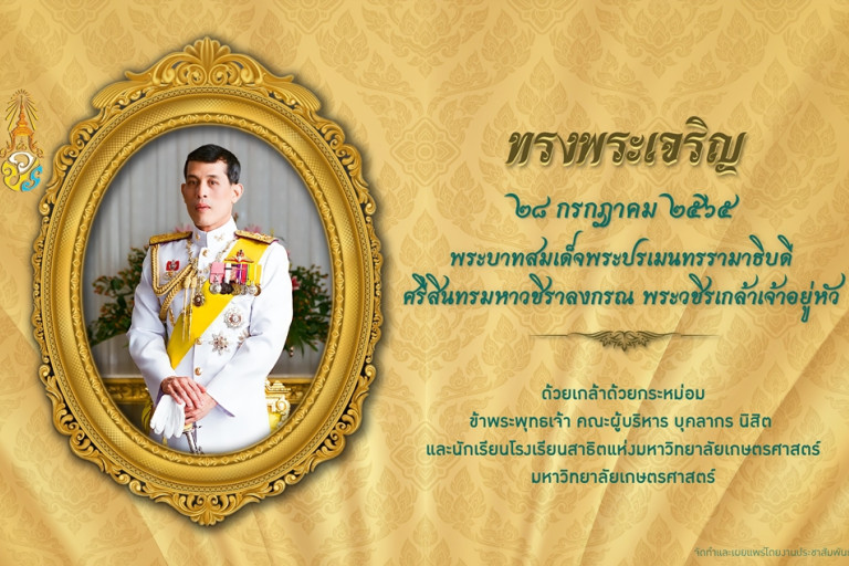 ชาวมหาวิทยาลัยเกษตรศาสตร์ รวมพลังแสดงความจงรักภักดี และน้อมสำนึกในพระมหากรุณาธิคุณ พระบาทสมเด็จพระวชิรเกล้าเจ้าอยู่หัว จัดพิธีถวายพระพรชัยมงคล และพิธีถวายสัตย์ปฏิญาณเพื่อเป็นข้าราชการที่ดีและพลังของแผ่นดิน เนื่องในโอกาสวันเฉลิมพระชนมพรรษา วันที่ 28 กรกฎาคม พ.ศ.2565 โดยทำพิธีพร้อมกันทั่วประเทศ เวลา 8.00 น. ถ่ายทอดสดทางออนไลน์ผ่านระบบซูม ในนามหน่วยงานสังกัด กระทรวงการอุดมศึกษา วิทยาศาสตร์ วิจัย และนวัตกรรม พร้อมเชิญชวนบุคลากร นิสิตปัจจุบัน นิสิตเก่า นักเรียน และ ประชาชน ร่วมถวายพระพรชัยมงคล ผ่านระบบออนไลน์ https://kuform.ku.ac.th/28jul2565/ ตั้งแต่วันที่ 26-31 กรกฎาคม 2565