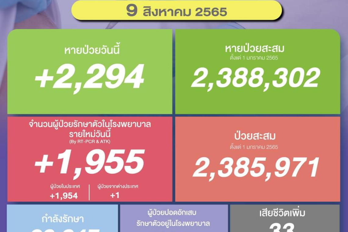 วันที่ 9 ส.ค.2565 ศูนย์ข้อมูล COVID-19 รายงานยอดผู้ติดเชื้อโควิด-19 รายใหม่วันนี้จำนวน 1,955 ราย แบ่งเป็นผู้ป่วยในประเทศ 1,954 ราย มาจากต่างประเทศ 1 ราย ทำให้ยอดผู้ป่วยสะสมตั้งแต่ 1 มกราคม 2565 มีจำนวน 2,385,971 ราย หายป่วยกลับบ้าน 2,294 ราย ทำให้ยอดหายป่วยสะสม ตั้งแต่ 1 มกราคม 2565 มีจำนวน 2,388,302 ราย ผู้ป่วยกำลังรักษา 20,947 ราย และเสียชีวิต 33 ราย รวมเสียชีวิตสะสมตั้งแต่ ปี 2563-ปัจจุบัน จำนวน 31,663 ราย