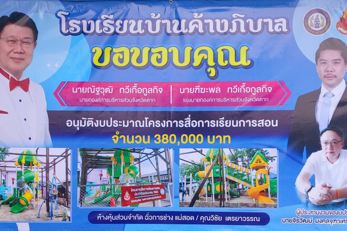 รร.บ้านค้างภิบาล ขึ้นป้ายขอบคุณ นายก.อบจ.ตาก-สจ.ชัย - เฮียหยี่ ผู้ใหญ่ใจดี สนับสนุน โครงการก่อสร้างสนามเด็กเล่น โรงเรียน