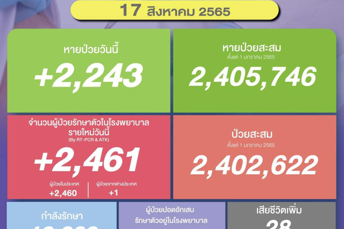 วันที่ 17 ส.ค.2565 ศูนย์ข้อมูล COVID-19 รายงานยอดผู้ติดเชื้อโควิด-19 รายใหม่วันนี้จำนวน 2,461 ราย แบ่งเป็นผู้ป่วยในประเทศ 2,460 ราย มาจากต่างประเทศ 1 ราย ทำให้ยอดผู้ป่วยสะสมตั้งแต่ 1 มกราคม 2565 มีจำนวน 2,402,622 ราย หายป่วยกลับบ้าน 2,243 ราย ทำให้ยอดหายป่วยสะสม ตั้งแต่ 1 มกราคม 2565 มีจำนวน 2,405,746 ราย ผู้ป่วยกำลังรักษา 19,902 ราย และเสียชีวิต 28 ราย รวมเสียชีวิตสะสมตั้งแต่ ปี 2563-ปัจจุบัน จำนวน 31,915 ราย