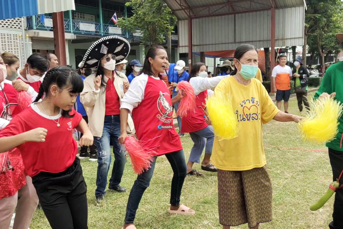 ส่วนไฮไลท์การแข่งขันที่ได้รับความสนใจคือกีฬาปิดตาตีปี๊บ ตีก๊อล์ฟคนจน ซึ่งการแข่งขันกีฬาสิ่งที่ขาดไม่ได้คือกองเชียร์วันนี้เรามาดูดาราดองเชียร์สาวใหญ่วัย 85 ปีกองเชียร์สีเหลือง ชื่อยายสำเนียง แจ้งประจักษ์ ชาวบ้านหมู่ 1 ตำบลบ้านกร่าง อำเภอศรีประจันต์ ยายบอกงานนี้สนุก ไม่เหนื่อย ไม่มีโรคภัย ยายชอบเสียงเพลงมากเวลาอยู่บ้านจะเปิดเพลงเสียงดังทุกวัน ยายว่างั้น ทำเอาแดนซ์เซอร์กองเชียร์สีต่างๆต้องชิดซ้าย บางช่วง มือกลองทีมยายเล่นเพลงไม่ถูกใจยายก็แอบไปร่วมกับสีอื่น จนทีมกองเชียร์ ของยายต้องมาพาตัวกลับ