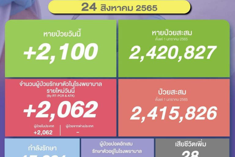 วันที่ 24 ส.ค.2565 ศูนย์ข้อมูล COVID-19 รายงานยอดผู้ติดเชื้อโควิด-19 รายใหม่วันนี้จำนวน 2,062 ราย แบ่งเป็นผู้ป่วยในประเทศ 2,062 ราย มาจากต่างประเทศ 0 ราย ทำให้ยอดผู้ป่วยสะสมตั้งแต่ 1 มกราคม 2565 มีจำนวน 2,415,826 ราย หายป่วยกลับบ้าน 2,100 ราย ทำให้ยอดหายป่วยสะสม ตั้งแต่ 1 มกราคม 2565 มีจำนวน 2,420,827 ราย ผู้ป่วยกำลังรักษา 17,831 ราย และเสียชีวิต 28 ราย รวมเสียชีวิตสะสมตั้งแต่ ปี 2563-ปัจจุบัน จำนวน 32,109 ราย