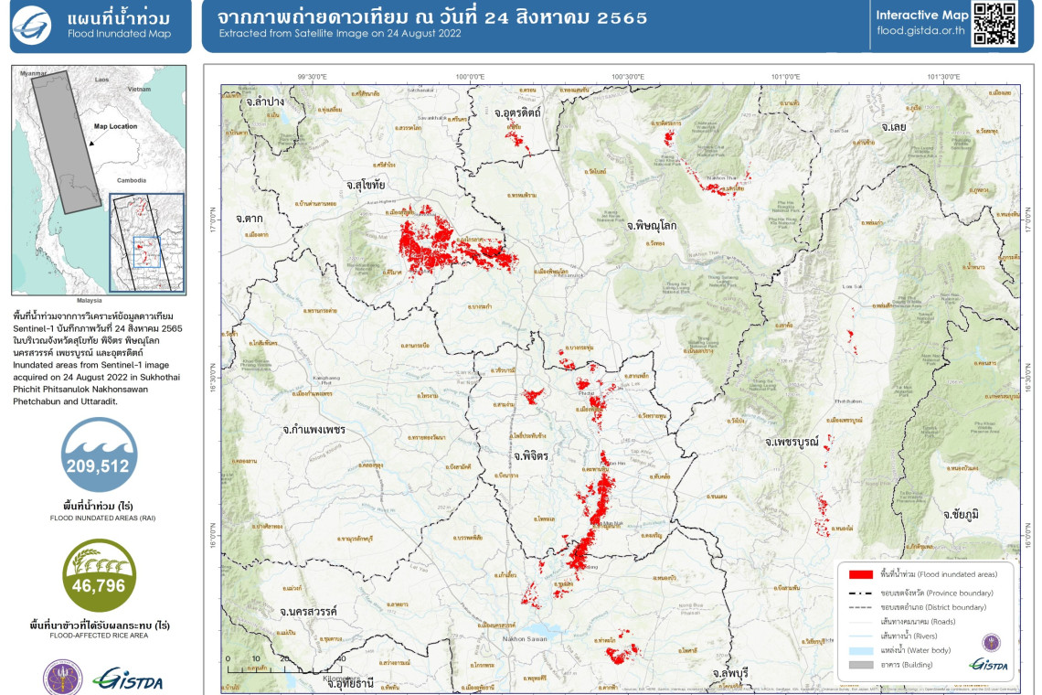 GISTDA ใช้ดาวเทียม Sentinel -1 เมื่อวันที่ 24 สิงหาคม 2565 ติดตามสถานการณ์น้ำท่วมในเขตภาคเหนือล่าสุดพบพื้นที่น้ำท่วมขังแล้วจำนวน 209,512 ไร่ ในพื้นที่บางส่วนของจังหวัดภาคเหนือตอนล่าง อาทิ #สุโขทัย 80,216 ไร่ #พิจิตร 61,659 ไร่ #พิษณุโลก 28,584 ไร่ #นครสวรรค์ 27,767 ไร่ #เพชรบูรณ์ 6,525 ไร่ #อุตรดิตถ์ 4,761 ไร่ ในขณะที่พื้นที่ปลูกข้าวก็ได้รับกระทบแล้วเช่นกันกว่า 46,796 หมื่นไร่
