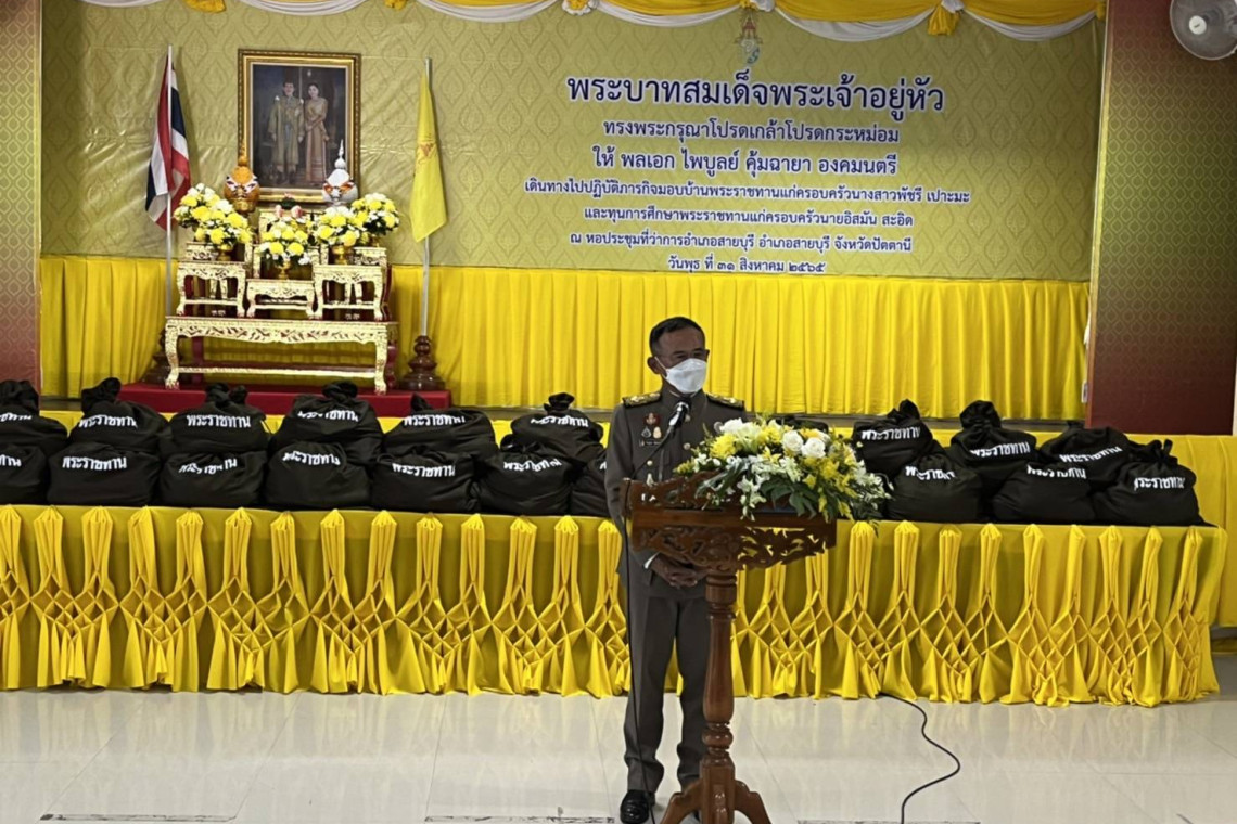 เมื่อวันที่ 31 สิงหาคม 2565 เวลา 12.18 น. พระบาทสมเด็จพระเจ้าอยู่หัว ทรงพระกรุณาโปรดเกล้าโปรดกระหม่อมให้พลเอก ไพบูลย์ คุ้มฉายา องคมนตรี เป็นประธานในพิธีมอบบ้านพระราชทานแก่ครอบครัวนางสาวพัชรี เปาะมะ ราษฎรตำบลตะลุบัน อำเภอสายบุรี จังหวัดปัตตานี ซึ่งได้ทูลเกล้าทูลกระหม่อมถวายฎีกาขอพระราชทานความช่วยเหลือเกี่ยวกับที่อยู่อาศัย และมอบทุนการศึกษาพระราชทานแก่ครอบครัว นายอิสมัน สะอิด ราษฎรตำบลตะลุโบะ อำเภอเมืองปัตตานี จังหวัดปัตตานี ซึ่งได้ทูลเกล้าทูลกระหม่อมถวายฎีกาขอพระราชทานความช่วยเหลือเกี่ยวกับทุนการศึกษา ณ หอประชุมที่ว่าการอำเภอสายบุรี อำเภอสายบุรี จังหวัดปัตตานี ในโอกาสนี้ ทรงพระกรุณาโปรดเกล้าโปรดกระหม่อมให้องคมนตรี เชิญถุงพระราชทานและเครื่องอุปโภคบริโภค จำนวน 300 ถุง ไปมอบแก่ราษฎรในพื้นที่จังหวัดปัตตานี โดยมีผู้ว่าราชการจังหวัด และนายอำเภอ ซึ่งเป็นตัวแทนราษฎรรับมอบ และจะเชิญไปมอบแก่ราษฎรในพื้นที่ต่อไป