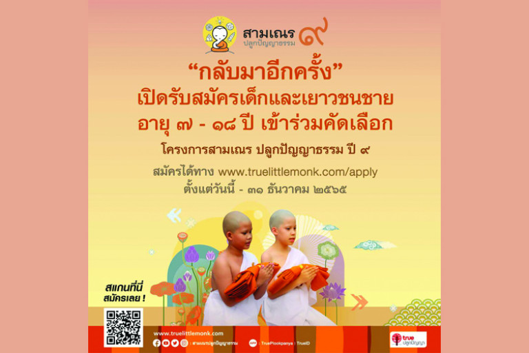 น้องๆ ที่สนใจใช้เวลาช่วงปิดเทอมอย่างมีคุณค่า ก้าวสู่เส้นทางพุทธบุตรครั้งหนึ่งในชีวิต สามารถสมัครด้วยการส่งประวัติ แนะนำตัว บอกเล่าเรื่องราวที่น่าสนใจของตนเอง พร้อมวิดีโอหรือภาพถ่าย และเรียงความเรื่อง “เหตุผลที่อยากบรรพชากับโครงการสามเณรปลูกปัญญาธรรมปี ๙” ผ่านทางออนไลน์ได้ที่ www.truelittlemonk.com/apply ตั้งแต่วันนี้ – 31 ธันวาคม 2565 ทั้งนี้ สามารถสอบถามรายละเอียดเพิ่มเติมได้ที่ โทร. 02-858-8339 (ในวันและเวลาทำการ)