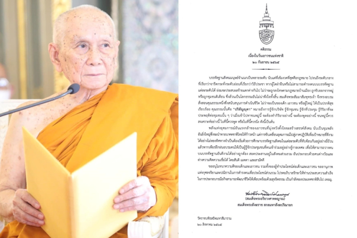 วันที่ 19 ก.ย.65 เจ้าพระคุณ สมเด็จพระอริยวงศาคตญาณ สมเด็จพระสังฆราช สกลมหาสังฆปริณายก ประทานพระคติธรรม เนื่องในวันเยาวชนแห่งชาติ ๒๐ กันยายน ๒๕๖๕ ความว่า ...