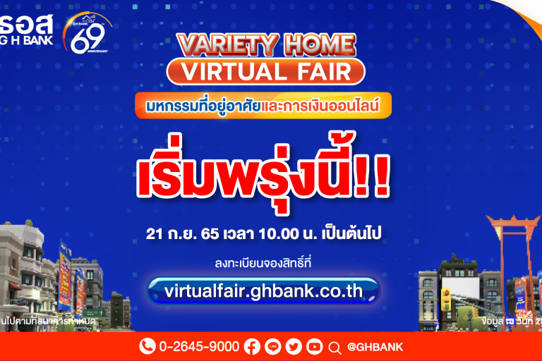 ธนาคารอาคารสงเคราะห์ (ธอส.) ฉลองครบรอบการดำเนินงาน 69 ปี จัดงาน Variety Home Virtual Fair : มหกรรมที่อยู่อาศัยและการเงินออนไลน์จาก ธอส. ครั้งที่ 2 เริ่มเปิดให้ลูกค้าประชาชนลงทะเบียนเข้าร่วมงานทางเว็บไซต์ virtualfair.ghbank.co.th ตั้งแต่วันพุธที่ 21 กันยายน 2565 เวลา 10.00 น. เป็นต้นไป พบกับโปรโมชั่นพิเศษที่มีเฉพาะในงานนี้ที่เดียวเท่านั้น สินเชื่อบ้านอัตราดอกเบี้ยพิเศษ ต่อที่ 1 ปีที่ 1 เท่ากับ MRR-4.46% (ปัจจุบันเท่ากับ 1.69%) ต่อปี อัตราดอกเบี้ยเฉลี่ย 3 ปีแรกเพียง 2.35% ให้กู้สำหรับซื้อที่อยู่อาศัยในราคาซื้อ-ขายไม่เกิน 3 ล้านบาท และยังมีสินเชื่ออัตราดอกเบี้ยต่ำแบบสุด ๆ ในช่วง Golden Minute เงินฝากออมทรัพย์อัตราดอกเบี้ยสูง 2.00% ต่อปี พร้อมช่วง Golden Minute รับอัตราดอกเบี้ยพิเศษเฉพาะในงานนี้ บ้านมือสอง ธอส. ราคาไม่เกิน 3 ล้านบาท มากกว่า 4,000 รายการทั่วประเทศ ให้ส่วนลดสูงสุดถึง 50% และบ้านมือหนึ่ง ราคาขายไม่เกิน 3 ล้านบาท จากผู้ประกอบการ