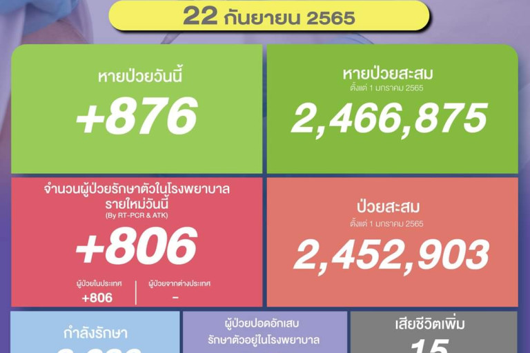 วันที่ 22 ก.ย.2565 ศูนย์ข้อมูล COVID-19 รายงานยอดผู้ติดเชื้อโควิด-19 รายใหม่วันนี้จำนวน 806 ราย แบ่งเป็นผู้ป่วยในประเทศ 806 ราย มาจากต่างประเทศ 0 ราย ทำให้ยอดผู้ป่วยสะสมตั้งแต่ 1 มกราคม 2565 มีจำนวน 2,452,903 ราย หายป่วยกลับบ้าน 876 ราย ทำให้ยอดหายป่วยสะสม ตั้งแต่ 1 มกราคม 2565 มีจำนวน 2,466,875 ราย ผู้ป่วยกำลังรักษา 8,286 ราย และเสียชีวิต 15 ราย รวมเสียชีวิตสะสมตั้งแต่ ปี 2563-ปัจจุบัน จำนวน 32,656 ราย