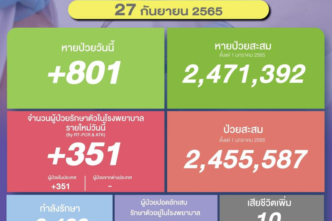 วันที่ 27 ก.ย.2565 ศูนย์ข้อมูล COVID-19 รายงานยอดผู้ติดเชื้อโควิด-19 รายใหม่วันนี้จำนวน 351 ราย แบ่งเป็นผู้ป่วยในประเทศ 351 ราย มาจากต่างประเทศ 0 ราย ทำให้ยอดผู้ป่วยสะสมตั้งแต่ 1 มกราคม 2565 มีจำนวน 2,455,587 ราย หายป่วยกลับบ้าน 801 ราย ทำให้ยอดหายป่วยสะสม ตั้งแต่ 1 มกราคม 2565 มีจำนวน 2,471,392 ราย ผู้ป่วยกำลังรักษา 6,490 ราย และเสียชีวิต 10 ราย รวมเสียชีวิตสะสมตั้งแต่ ปี 2563-ปัจจุบัน จำนวน 32,709 ราย