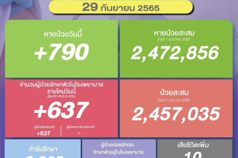 วันที่ 29 ก.ย.2565 ศูนย์ข้อมูล COVID-19 รายงานยอดผู้ติดเชื้อโควิด-19 รายใหม่วันนี้จำนวน 637 ราย แบ่งเป็นผู้ป่วยในประเทศ 637 ราย มาจากต่างประเทศ 0 ราย ทำให้ยอดผู้ป่วยสะสมตั้งแต่ 1 มกราคม 2565 มีจำนวน 2,457,035 ราย หายป่วยกลับบ้าน 790 ราย ทำให้ยอดหายป่วยสะสม ตั้งแต่ 1 มกราคม 2565 มีจำนวน 2,472,856 ราย ผู้ป่วยกำลังรักษา 6,365 ราย และเสียชีวิต 10 ราย รวมเสียชีวิตสะสมตั้งแต่ ปี 2563-ปัจจุบัน จำนวน 32,728 ราย