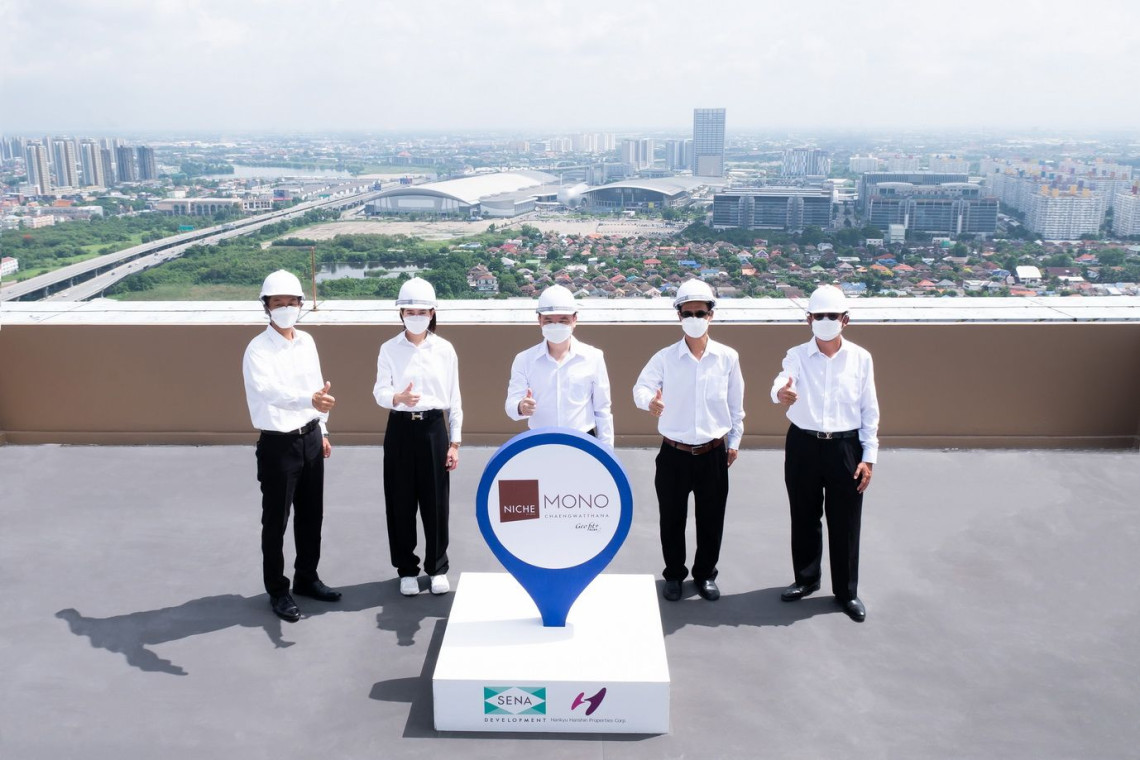 อุมาพร ธัญลักษณ์ภาคย์ กรรมการ สมยศ ธเนศวรางกูร ผู้ช่วยกรรมการผู้จัดการ บริษัท เสนาดีเวลลอปเม้นท์ จำกัด (มหาชน) มิสึฮิโระ นาคาซาว่า กรรมการผู้จัดการ บริษัท ฮันคิว ฮันชิน พร็อพเพอร์ตี้ส์ คอร์ป วรพงศ์ ปรีชา กรรมการผู้จัดการ บริษัท ทีม คอนสตรัคชั่น แมเนจเมนท์ จำกัด ชินทัต ณ ระนอง ผู้อำนวยการฝ่ายก่อสร้าง 4 บริษัท ซินเท็ค คอนสตรัคชั่น จำกัด (มหาชน) ถ่ายภาพเป็นที่ระลึกพิธีเทปูนปิดยอดอาคารคอนโดมิเนียมพร้อมโอนเข้าอยู่แล้ววันนี้