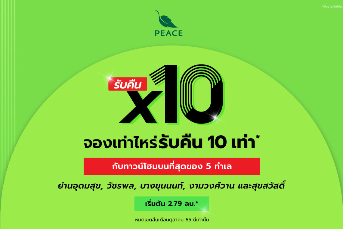 บริษัท พีซแอนด์ลีฟวิ่ง จำกัด (มหาชน) ผู้พัฒนาอสังหาริมทรัพย์ประเภทที่อยู่อาศัยแนวราบที่มีประสบการณ์มากว่า 30 ปี ส่งโปรโมชั่นสุดพิเศษต้อนรับไตรมาสสุดท้ายของปีกับ “โปรคูณ10” จองเท่าไหร่ รับคืนไปเลย 10 เท่า เพียงจองภายในเดือนตุลาคมนี้เท่านั้น ในราคาสุดพิเศษเริ่มต้นที่ 2.79 ล้านบาท* เพื่อมอบสิทธิพิเศษให้สำหรับลูกค้าที่สนใจเป็นเจ้าของทาวน์โฮมคุณภาพบน 5 ทำเลทอง ที่ก่อสร้างด้วยอิฐมอญแดง และลงเสาเข็มหลังบ้านให้กับทุกหลัง ได้แก่