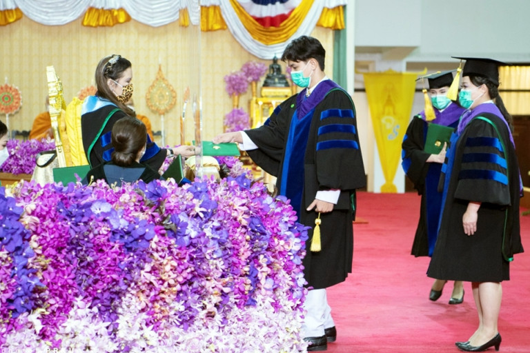 โอกาสนี้ สมเด็จพระเจ้าน้องนางเธอ เจ้าฟ้าจุฬาภรณวลัยลักษณ์ อัครราชกุมารี กรมพระศรีสวางควัฒน วรขัตติยราชนารี พระราชทานพระโอวาท ความตอนหนึ่งว่า ขอแสดงความชื่นชมกับผู้ทรงคุณวุฒิและบัณฑิตทุกคนที่ได้รับเกียรติและความสำเร็จ บัณฑิตทั้งหลายเมื่อสำเร็จการศึกษาแล้ว คงจะได้ออกไปประกอบอาชีพการงานหรือศึกษาต่อในระดับที่สูงขึ้น เพื่อสร้างความสำเร็จที่สูงขึ้นไป การจะบรรลุถึงความสำเร็จดังกล่าวนั้น ต้องอาศัยปัจจัยสำคัญหลายประการ ประการแรก ความรับผิดชอบต่อหน้าที่ คือไม่ว่าจะศึกษาเล่าเรียนหรือทำงานใด ก็ต้องลงมือปฏิบัติอย่างเอาใจใส่ โดยใช้ความรู้ความสามารถที่มีอยู่ ศึกษาทำความเข้าใจสิ่งที่ต้องทำให้ทราบชัด แล้วกำหนดแนวทาง วิธีการ และขั้นตอนการปฏิบัติ ให้ถูกต้องเหมาะสม จนงานในหน้าที่สำเร็จผลอย่างมีประสิทธิภาพ ประการที่สอง การสร้างความสัมพันธ์อันดีกับบุคคลอื่น คือต้องเรียนรู้ที่จะอยู่ร่วมกับผู้อื่นในสังคม ด้วยการเปิดใจกว้าง รับฟังแนวคิดและข้อเสนอแนะต่างๆ โดยปราศจากอคติ ประการที่สาม การพร้อมรับความเปลี่ยนแปลงของโลก คือต้องปรับตัวให้เท่าทันการเปลี่ยนแปลง ด้วยการทำตัวให้พร้อมที่จะเรียนรู้สิ่งใหม่อยู่เสมอ โดยเฉพาะอย่างยิ่งในสถานการณ์ที่โรคติดเชื้อไวรัสโคโรนา 2019 ยังคงแพร่ระบาดอยู่ ทำให้จำเป็นที่จะต้องนำเทคโนโลยีสารสนเทศมาประยุกต์ใช้ในการศึกษาเล่าเรียนและการทำงาน จึงขอให้บัณฑิตทุกคน พยายามเสริมสร้างปัจจัยแห่งความสำเร็จทั้งสามประการ ให้เจริญงอกงามขึ้น แต่ละคนจะได้สามารถสร้างความสำเร็จที่สูงขึ้นไป คือความเจริญมั่นคงในชีวิตและกิจการงานได้ สมดังที่มุ่งหวัง