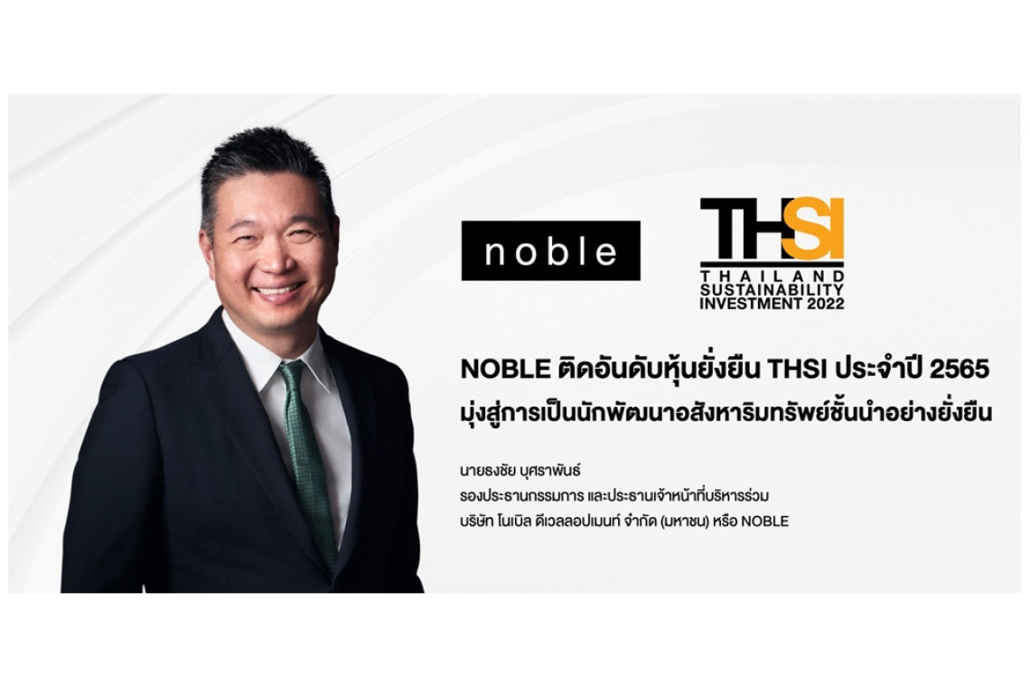 นายธงชัย บุศราพันธ์ รองประธานกรรมการ และประธานเจ้าหน้าที่บริหารร่วม บริษัท โนเบิล ดีเวลลอปเมนท์ จำกัด (มหาชน) หรือ NOBLE ผู้นำด้านการพัฒนาอสังหาริมทรัพย์โครงการที่อยู่อาศัยในทำเลชั้นนำของกรุงเทพมหานครและปริมณฑล เปิดเผยว่า บริษัทฯ ได้รับเลือกเป็น 1 ใน 170 บริษัทจดทะเบียนหุ้นยั่งยืน หรือ Thailand Sustainability Investment (THSI) ประจำปี 2565 ประเภทกลุ่มอสังหาริมทรัพย์และก่อสร้าง จากตลาดหลักทรัพย์แห่งประเทศไทย ซึ่งเป็นการสะท้อนให้เห็นถึงความมุ่งมั่นขององค์กรที่ตระหนักและให้ความสำคัญในการดำเนินธุรกิจอย่างมีความรับผิดชอบต่อสิ่งแวดล้อม สังคม และการบริหารงานภายใต้หลักบรรษัทภิบาล (Environment, Social and Governance : ESG) สอดคล้องกับการพัฒนาโครงการอสังหาริมทรัพย์ที่อยู่อาศัยบนพื้นที่สีเขียวซึ่งเป็นมิตรต่อสิ่งแวดล้อม เพื่อตอบโจทย์ความต้องการของลูกค้าอย่างแท้จริง ตลอดจนสร้างการเติบโตทางธุรกิจอย่างยั่งยืนภายใต้การเพิ่มมูลค่าให้กับผู้ถือหุ้น โดยการสร้างผลตอบแทนที่ดีควบคู่ไปกับการขับเคลื่อนองค์กรสู่การเติบโตอย่างยั่งยืน คำนึงถึงความสำคัญของผู้มีส่วนได้เสียทุกภาคส่วนที่เป็นไปตามเกณฑ์การประเมินด้านความยั่งยืนของตลาดหลักทรัพย์ฯ และสอดคล้องกับมาตรฐานสากล ซึ่งปัจจัยดังกล่าวจะเป็นตัวผลักดันให้บริษัทฯมุ่งสู่การเป็นนักพัฒนาอสังหาริมทรัพย์ชั้นนำในประเทศไทยอย่างยั่งยืน