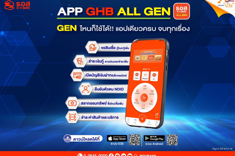 ธนาคารอาคารสงเคราะห์ (ธอส.) มุ่งสู่การเป็น Fully Digital Bank ในปี 2565 ยกระดับการให้บริการด้านดิจิทัลของธนาคารผ่าน Mobile Application ปรับโฉมและพัฒนาสุดยอดเทคโนโลยี ตอบโจทย์ Lifestyle และความต้องการลูกค้ายุค New Normal จาก GHB ALL สู่ GHB ALL GEN แอปที่ใช้ได้ทุกเพศทุกวัย!! แอปเดียวครบ จบทุกเรื่อง เพิ่มฟังก์ชั่นการให้บริการในเฟสที่ 1 อาทิ ยื่นขอสินเชื่อ ชำระเงินกู้ เปิดบัญชีเงินฝากอิเล็กทรอนิกส์ ซื้อสลากออมทรัพย์ และชำระค่าสินค้าและบริการ พร้อมเปิดให้ลูกค้าดาวน์โหลด และเริ่มใช้งานตั้งแต่วันที่ 26 ตุลาคม 2565 เป็นต้นไป