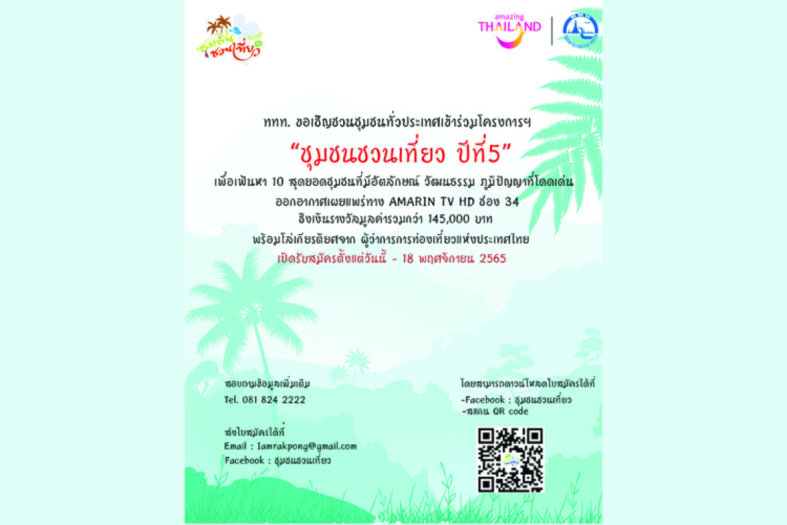 ททท.ขอเชิญชวนชุมชนทั่วประเทศเข้าร่วมโครงการฯ"ชุมชนชวนเที่ยว ปีที่ 5"เพื่อเฟ้นหา 10 สุดยอดชุมชนที่มีอัตลักษณ์ วัฒนธรรม ภูมิปัญญาที่โดดเด่น ออกอากาศและแพร่ทาง AMARIN TV HD ช่อง 34 ชิงเงินรางวัลมูลค่ารวมกว่า 145,000 บาท พร้อมโล่เกียรติยศจาก ผู้ว่าการการท่องเที่ยวแห่งประเทศไทย เปิดรับสมัครตั้งแต่วันนี้ -18 พฤศจิกายน 2565