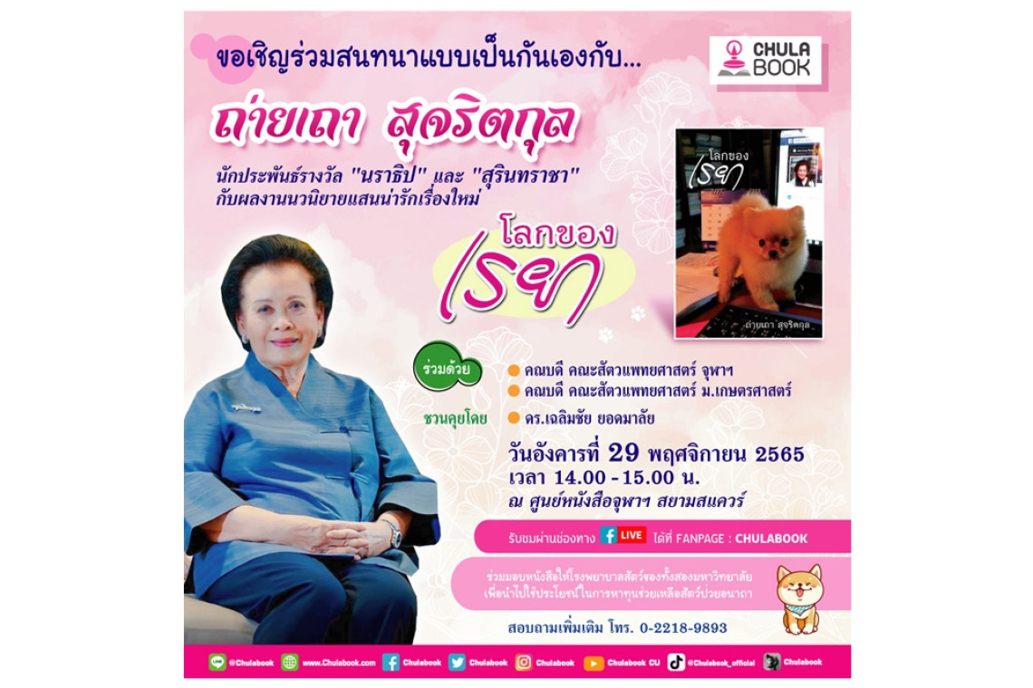 ศูนย์หนังสือจุฬาลงกรณ์มหาวิทยาลัย ขอเชิญร่วมงานสนทนาพูดคุยแบบเป็นกันเอง กับ ถ่ายเถา สุจริตกุล เจ้าของรางวัล “นราธิป” และ “สุรินทราชา” กับผลงานนวนิยายแสนน่ารักเรื่องใหม่ “โลกของเรยา” พร้อมแขกรับเชิญที่จะมาร่วมพูดคุย ได้แก่ คณบดี คณะสัตวแพทยศาสตร์ จุฬาลงกรณ์มหาวิทยาลัย และคณบดี คณะสัตวแพทยศาสตร์ มหาวิทยาลัยเกษตรศาสตร์ ชวนคุยโดย คุณเฉลิมชัย ยอดมาลัย ในวันอังคารที่ 29 พฤศจิกายน 2565 เวลา 14.00 – 15.00 น. ณ ศูนย์หนังสือจุฬาฯ สยามสแควร์ และรับชมผ่านทาง Facebook Live ได้ที่เพจ Chulabook สอบถามรายละเอียดเพิ่มเติม ได้ที่ แผนกประชาสัมพันธ์ โทร. 0-2218-9893