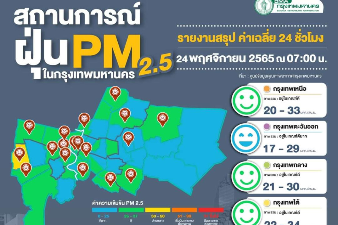 วันที่ 24 พ.ย.2565 กรุงเทพมหานคร แจ้งว่าผลการตรวจวัดฝุ่นละออง PM2.5 เวลา 07.00 น. ค่าฝุ่นละออง PM2.5 มีแนวโน้มลดลงและพบว่าอยู่ในเกณฑ์มาตรฐานทุกพื้นที่ที่มีการตรวจวัด ตรวจวัดได้ 14-42 ไมโครกรัม/ลูกบาศก์เมตร (มคก./ลบ.ม.) ทั้งนี้พบฝุ่น PM2.5 ไม่เกินเกณฑ์มาตรฐานทุกจุด (ค่ามาตรฐาน 50 มคก./ลบ.ม.)