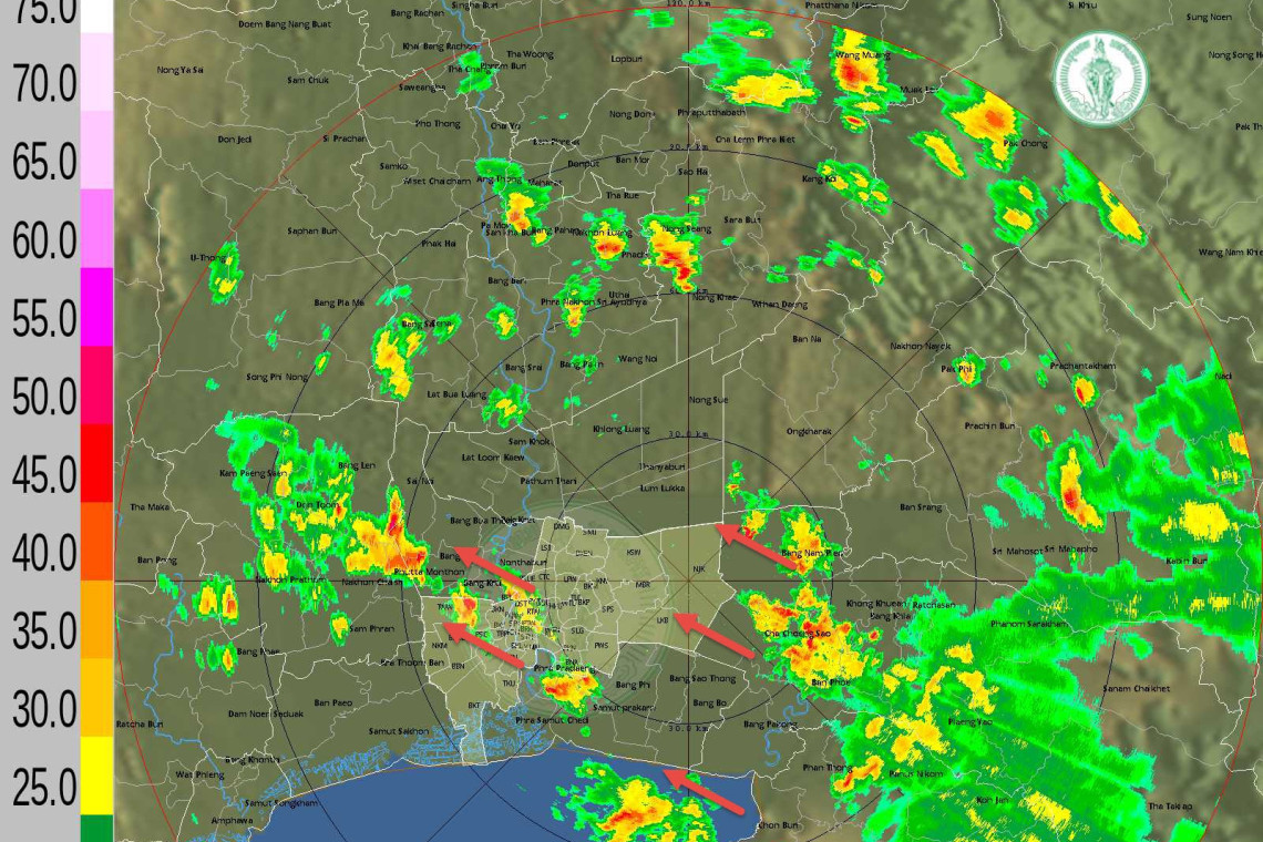 วันที่ 24 พฤศจิกายน 2565 / เวลา 16.30 น. ฝนเล็กน้อยถึงปานกลาง เขตวัฒนา ดินแดง ราชเทวี พญาไท ดุสิต บางซื่อ และพื้นที่ฝั่งธนบุรี เขตภาษีเจริญ ตลิ่งชัน เคลื่อนตัวทิศตะวันตกเฉียงเหนือ ปริมาณฝนสูงสุด เขตพญาไท 13.5 มม./ รอบนอกฝนเล็กน้อยถึงปานกลาง จ.สมุทรปราการ ต่อเนื่องพื้นที่เขตบางนา