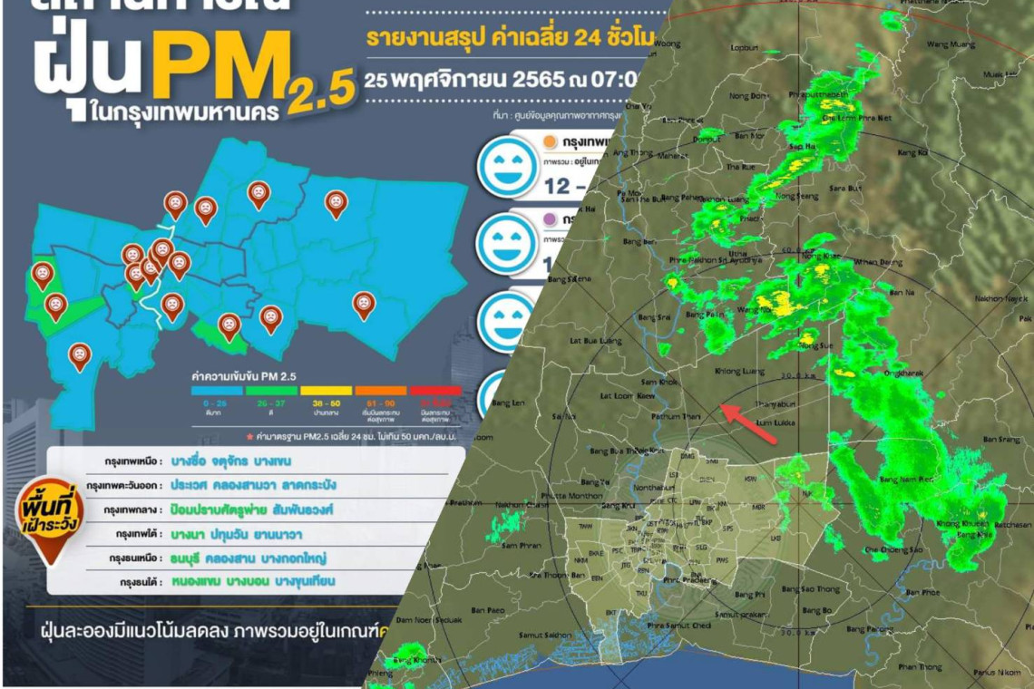 หย่อมความกดอากาศต่ำกำลังแรงบริเวณชายฝั่งประเทศเวียดนามตอนล่าง เคลื่อนผ่านปลายแหลมญวนเข้าสู่อ่าวไทยในช่วงวันที่ 22-25 พ.ย. 65 ประกอบกับร่องมรสุมพาดผ่านภาคใต้ตอนกลาง ส่งผลให้มีฝนตกหนักถึงหนักมากบางแห่งในพื้นที่กรุงเทพมหานครและปริมณฑล และวันนี้กรุงเทพมหานครและปริมณฑล มีฝนฟ้าคะนองร้อยละ 70 ของพื้นที่ และมีฝนตกหนักถึงหนักมากบางแห่ง ลมอ่อน อัตราการระบายฝุ่นละอองไม่ดี ความเข้มของฝุ่นละออง PM2.5 ต่ำ