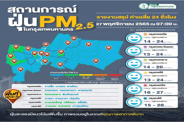 ศูนย์ข้อมูลคุณภาพอากาศกรุงเทพมหานครสรุปผลการตรวจวัด PM2.5 ประจำวันที่ 27 พ.ย. 65 ณ เวลา 07.00 น. ค่าฝุ่นละออง PM2.5 มีแนวโน้มเพิ่มขึ้นและพบว่าอยู่ในเกณฑ์มาตรฐานทุกพื้นที่ที่มีการตรวจวัด ตรวจวัดได้ 9-28 ไมโครกรัม/ลูกบาศก์เมตร (มคก./ลบ.ม.)