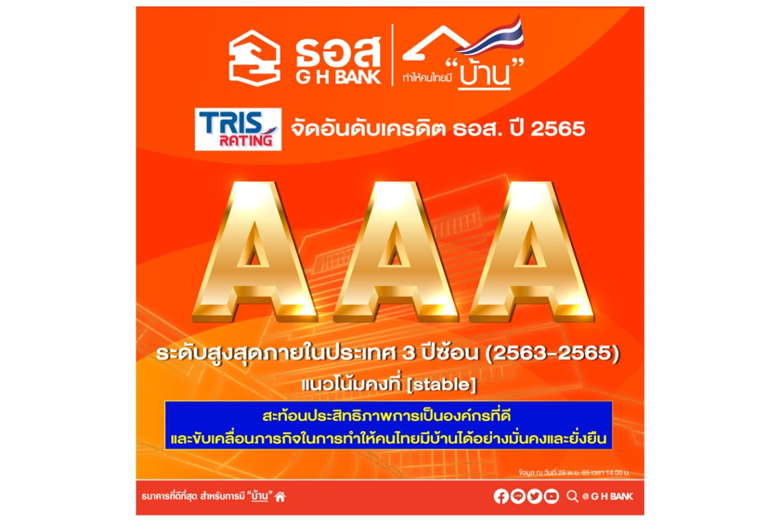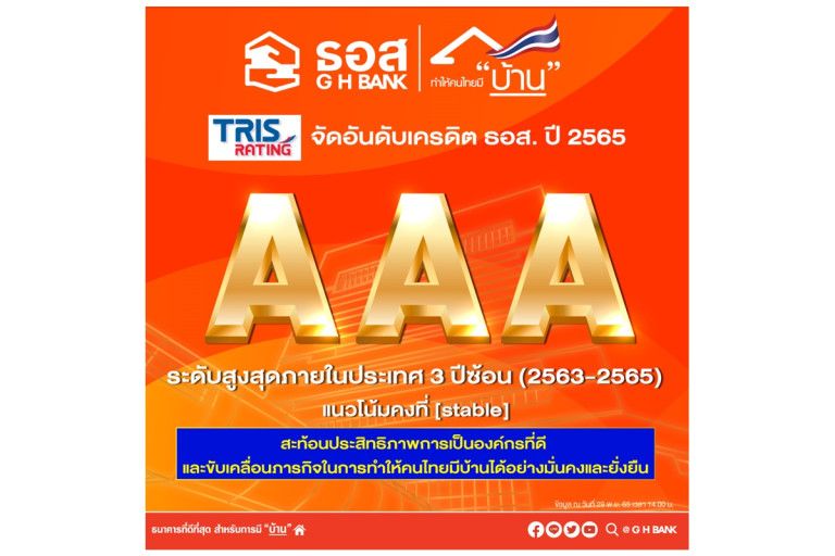 ธนาคารอาคารสงเคราะห์เผย ทริสเรทติ้ง คงอันดับเครดิตองค์กรในระดับ AAA เป็นปีที่ 3 ติดต่อกัน และแนวโน้มอันดับเครดิตของ ธอส. ที่ระดับคงที่ สะท้อนความแข็งแกร่งของสถานะทางการเงินของธนาคาร