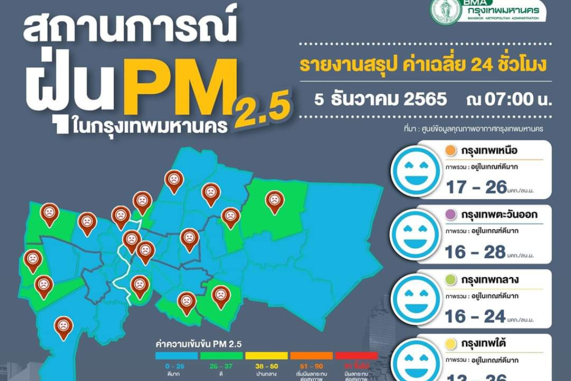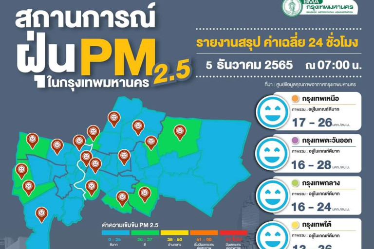วันที่ 5 ธ.ค.2565 ศูนย์ข้อมูลคุณภาพอากาศกรุงเทพมหานคร รายงานสถานการณ์คุณภาพอากาศ พื้นที่กรุงเทพฯและปริมณฑล วันที่ 5 ธ.ค. พ.ย.2565 เวลา 07.00 น.พบคุณภาพอากาศอยู่ในระดับดีมากถึงคุณภาพดี ตรวจพบฝุ่นละออง ขนาดไม่เกิน 2.5 ไมครอน (PM2.5) ตรวจพบค่าระหว่าง 11-36 ไมโครกรัมต่อลูกบาศก์เมตร (µg/m3) ไม่เกินเกณฑ์มาตรฐานทุกจุด (PM2.5 ค่ามาตรฐาน เฉลี่ย 24 ชม. ไม่เกิน 50 มคก./ลบ.ม.)