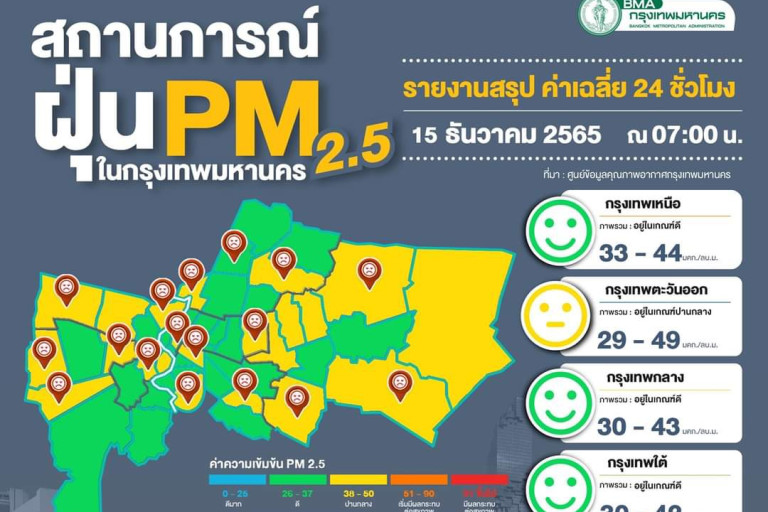 วันที่ 15 ธ.ค.2565 ศูนย์ข้อมูลคุณภาพอากาศกรุงเทพมหานคร รายงนผลการตรวจวัดฝุ่นละออง PM2.5 ประจำวันที่ 15 ธ.ค. 65 ณ เวลา 07.00 น. ค่าฝุ่นละออง PM2.5 มีแนวโน้มเพิ่มขึ้นและพบว่าอยู่ในเกณฑ์มาตรฐานทุกพื้นที่ที่มีการตรวจวัด ตรวจวัดได้ 26-49 ไมโครกรัม/ลูกบาศก์เมตร (มคก./ลบ.ม.)
