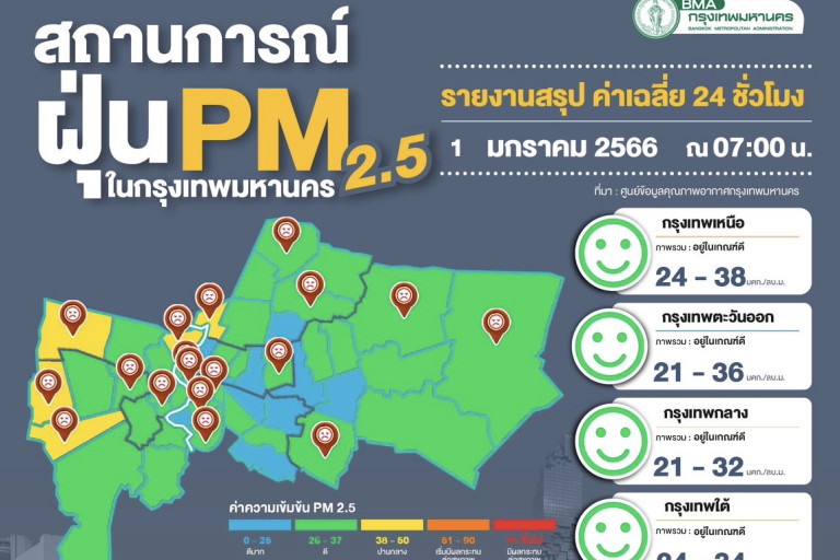 ผลการตรวจวัดฝุ่นละออง PM2.5 ประจำวันที่ 1 ม.ค. 66 ณ เวลา 07.00 น. โดยสำนักสิ่งแวดล้อม ค่าฝุ่นละออง PM2.5 มีแนวโน้มเพิ่มขึ้นและพบว่าอยู่ในเกณฑ์มาตรฐานทุกพื้นที่ที่มีการตรวจวัด ตรวจวัดได้ 19-48 ไมโครกรัม/ลูกบาศก์เมตร (มคก./ลบ.ม.) ค่าเฉลี่ยของกรุงเทพมหานคร 29.6 มคก./ลบ.ม.