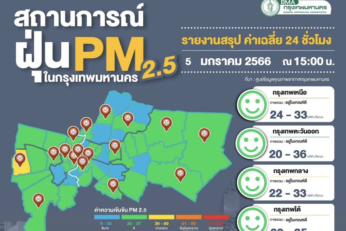 ศูนย์ข้อมูลคุณภาพอากาศกรุงเทพมหานครสรุปผลการตรวจวัด PM2.5 เวลา 13.00-15.00 น. (3 ชั่วโมงล่าสุด) ตรวจวัดได้ 18-40 มคก./ลบ.ม. ค่าเฉลี่ยของกรุงเทพมหานคร 27.0 มคก./ลบ.ม. ค่า PM2.5 มีแนวโน้มลดลงและอยู่ในเกณฑ์มาตรฐานทุกสถานีที่มีการตรวจวัด