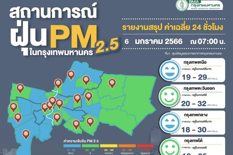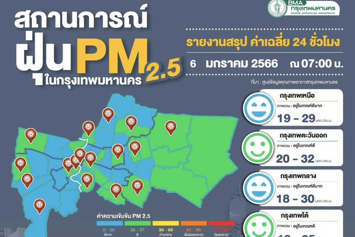 ศูนย์ข้อมูลคุณภาพอากาศกรุงเทพมหานครรายงานสถานการณ์ฝุ่นละอองขนาดไม่เกิน 2.5 ไมครอน (PM 2.5) ของสถานีตรวจวัดคุณภาพอากาศของกรุงเทพมหานคร ประจำวันศุกร์ที่ 6 มกราคม พ.ศ. 2566 เวลา 07.00 น. ค่าเฉลี่ย24 ชั่วโมง ของฝุ่นละอองขนาดไม่เกิน 2.5 ไมครอน (PM2.5) ตรวจวัดได้ 14-36 ไมโครกรัม/ลูกบาศก์เมตร (มคก./ลบ.ม.) พบว่าไม่เกินมาตรฐานทุกพื้นที่ที่มีการตรวจวัด (มาตรฐานไม่เกิน 50 มคก./ลบ.ม.) ดัชนีคุณภาพอากาศของสถานีตรวจวัดของกรุงเทพมหานคร ส่วนใหญ่อยู่ในระดับคุณภาพอากาศดีมาก