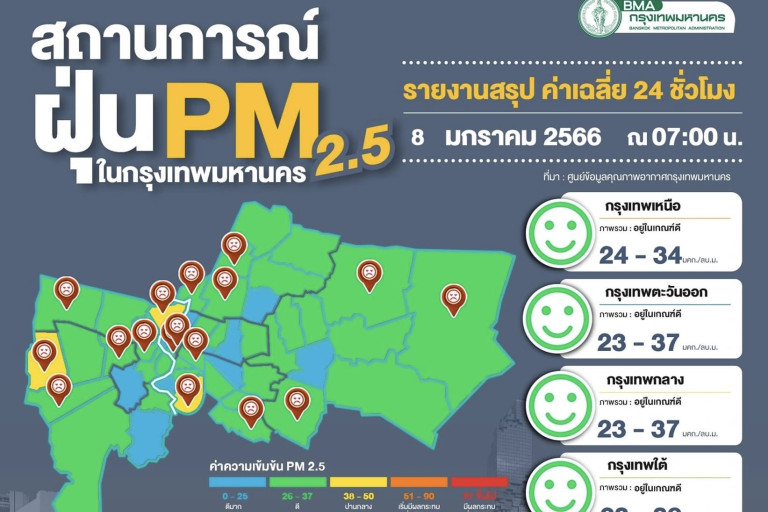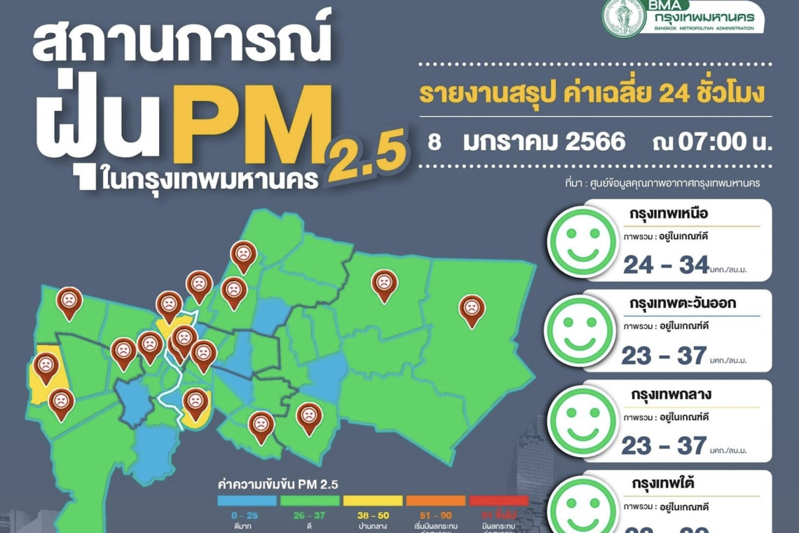 ศูนย์ข้อมูลคุณภาพอากาศกรุงเทพมหานครรายงานสถานการณ์ฝุ่นละอองขนาดไม่เกิน 2.5 ไมครอน (PM 2.5) ของสถานีตรวจวัดคุณภาพอากาศของกรุงเทพมหานคร ประจำวันอาทิตย์ที่ 8 มกราคม พ.ศ. 2566 เวลา 07.00 น. ค่าเฉลี่ย 24 ชั่วโมง ของฝุ่นละอองขนาดไม่เกิน 2.5 ไมครอน (PM2.5) ดัชนีคุณภาพอากาศของสถานีตรวจวัดของกรุงเทพมหานคร ส่วนใหญ่อยู่ในระดับคุณภาพอากาศดี ตรวจวัดได้ค่าต่ำสุด 23 ค่าสูงสุด 39 มคก./ลบ.ม.