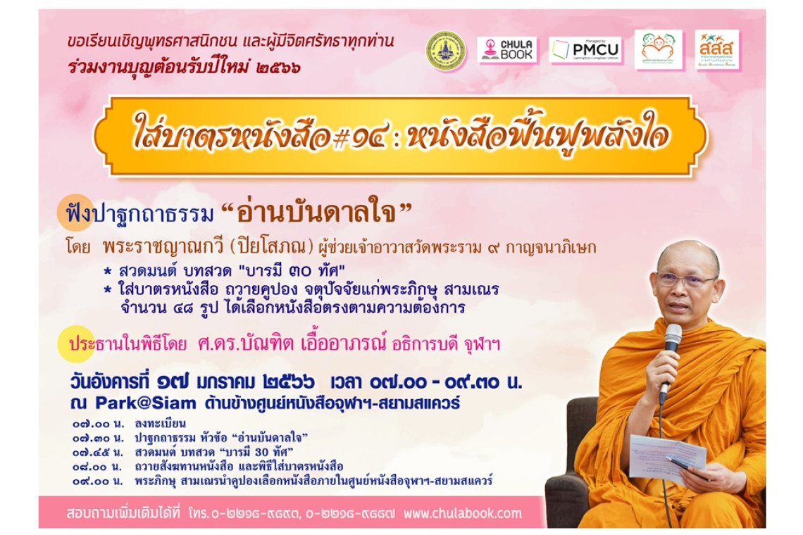 ในวาระศุภมิ่งมงคลขึ้นปีใหม่ 2566 ศูนย์หนังสือจุฬาลงกรณ์มหาวิทยาลัย ร่วมกับ วัดพระราม ๙ กาญจนาภิเษก สำนักงานจัดการทรัพย์สินจุฬาลงกรณ์มหาวิทยาลัย และ แผนงานสร้างเสริมวัฒนธรรมการอ่าน (สสส.) ขอเชิญร่วมกิจกรรม “ใส่บาตรหนังสือ ครั้งที่ 14 : หนังสือฟื้นฟูพลังใจ” โดยเปิดโอกาสให้ประชาชนชาวไทยได้ร่วมกันทำบุญใส่บาตรหนังสือให้กับพระสงฆ์และสามเณร จำนวน 48 รูป ซึ่งกำลังศึกษาอยู่ในโรงเรียนพระปริยัติธรรม