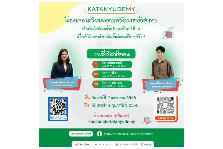 กตัญญูเดมี่ (Katanyudemy) โครงการพัฒนาการศึกษาเยาวชนไทย เปิดโครงการเตรียมความพร้อมทางวิชาการ สำหรับนักเรียนชั้นประถมศึกษาปีที่ 6 เพื่อเข้าศึกษาต่อในระดับมัธยมศึกษาปีที่ 1 ติวเข้มวิชาคณิตศาสตร์ ภาษาอังกฤษ และภาษาไทย ทุกวันเสาร์ต่อเนื่องกัน 5 สัปดาห์ โดยติวเตอร์คุณภาพ โดยอาจารย์ปุณทิศา กลัดทอง และอาจารย์เชี่ยวเวทย์ เจริญพร เรียนฟรี ไม่มีค่าใช้จ่าย* เริ่มตั้งแต่วันเสาร์ที่ 7 มกราคม - วันเสาร์ที่ 4 กุมภาพันธ์ 2566 เนื้อหาอัดแน่น เรียนทุกวันเสาร์ ต่อเนื่องกัน 5 สัปดาห์