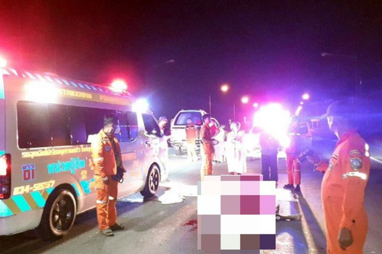 ที่เกิดเหตุพบรถยนต์เก๋งยี่ห้อโตโยต้าโคโรน่าสีขาว ทะเบียนกาญจนบุรี ซึ่งเป็นรถที่ดัดแปลงทำเครื่องเสียง จอดอยู่ในสภาพด้านหน้าชนท้ายรถจักรยานยนต์ฮอนด้าเวฟ 110 ซีซี.สีน้ำเงิน ทะเบียนสงขลา ใกล้กันพบร่างผู้เสียชีวิตเป็นผู้ชายนอนหงายจมกองเลือดในสภาพกะโหลกศีรษะและใบหน้าแตกฉีดขาดหายไปครึ่งหน้าซึ่งเป็นภาพที่น่าอุดจาดต่อผู้พบเห็นยิ่งนัก ใกล้กันมีผู้ได้รับบาดเจ็บสาหัสอีก 1 ราย เจ้าหน้ามูลนิธิฯ จึงได้รีบนำตัวส่ง รพ.ค่ายฯ เนื่องจากอาการสาหัส ก่อนหน้าที่เจ้าหน้าที่ตำรวจจะไปถึง