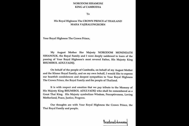 พระบามสมเด็จพระบรมนาถนโรดม สีหมุนี พระมหากษัตริย์แห่งราชอาณาจักรกัมพูชา ทรงส่งพระราชสาส์นแสดงความเสียพระราชหฤทัยถึงสมเด็จพระบรมโอรสาธราช เจ้าฟ้ามหาวชิราลงกรณ สยามมกุฏราชกุมาร แห่งราชอาณาจักรไทย ต่อการเสด็จสวรรคตของพระบาทสมเด็จพระเจ้าอยู่หัวในพระบรมโกศ ความว่า พระองค์ และสมาชิกราชวงศ์กัมพูชาได้รับทราบข่าวการสวรรคต ซึ่งในนามของประชาชนกัมพูชา สมเด็จพระมารดา แบะสมาชิกราชวงศ์ทั้งหมดขอแสดงความเสียใจมาอย่างสุดซึ้งถึงพระองค์ สมาชิกราชวงศ์ และประชาชนไทย ด้วยความสำนักยิ่ง และความเคารพต่อพระบาทสมเด็จพระเจ้าอยู่หัวในพระบรมโกศ จะจดจำพระองค์ไว้ในฐานะพระมหากษัตริย์ไทยที่ยิ่งใหญ่ ผู้เป็นสัญลักษณ์แห่งสติปัญญา ความระลึกถึง ที่รักแห่งมาตุภูมิ สัติสุข ความยุติธรรม และความเจริญก้าวหน้า